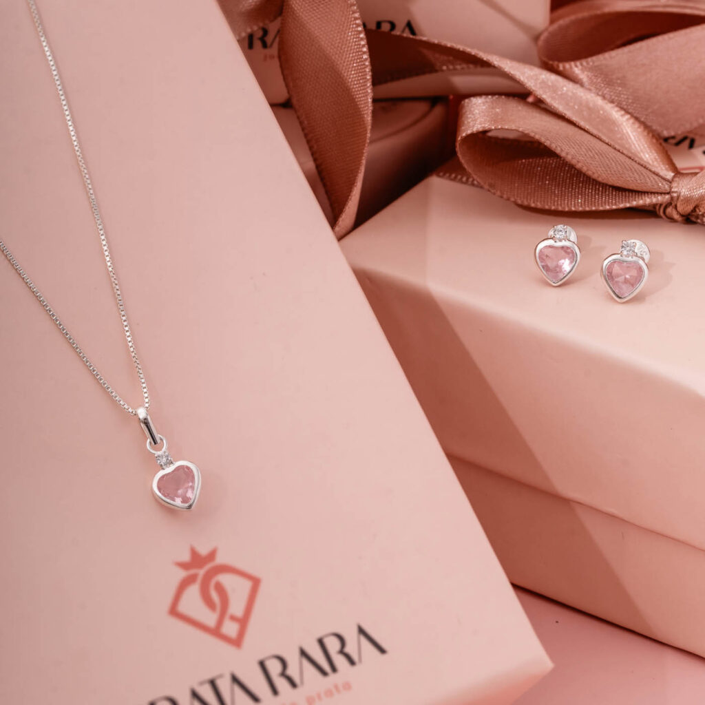 Conjunto Coracao c/ Zircônia Rosa