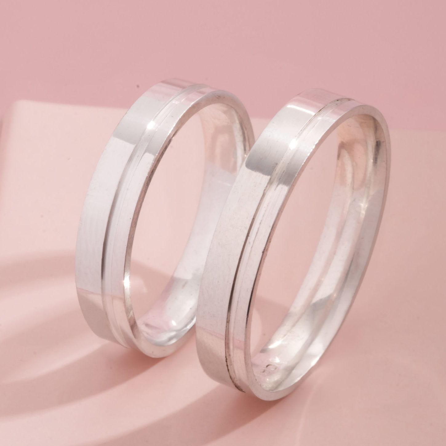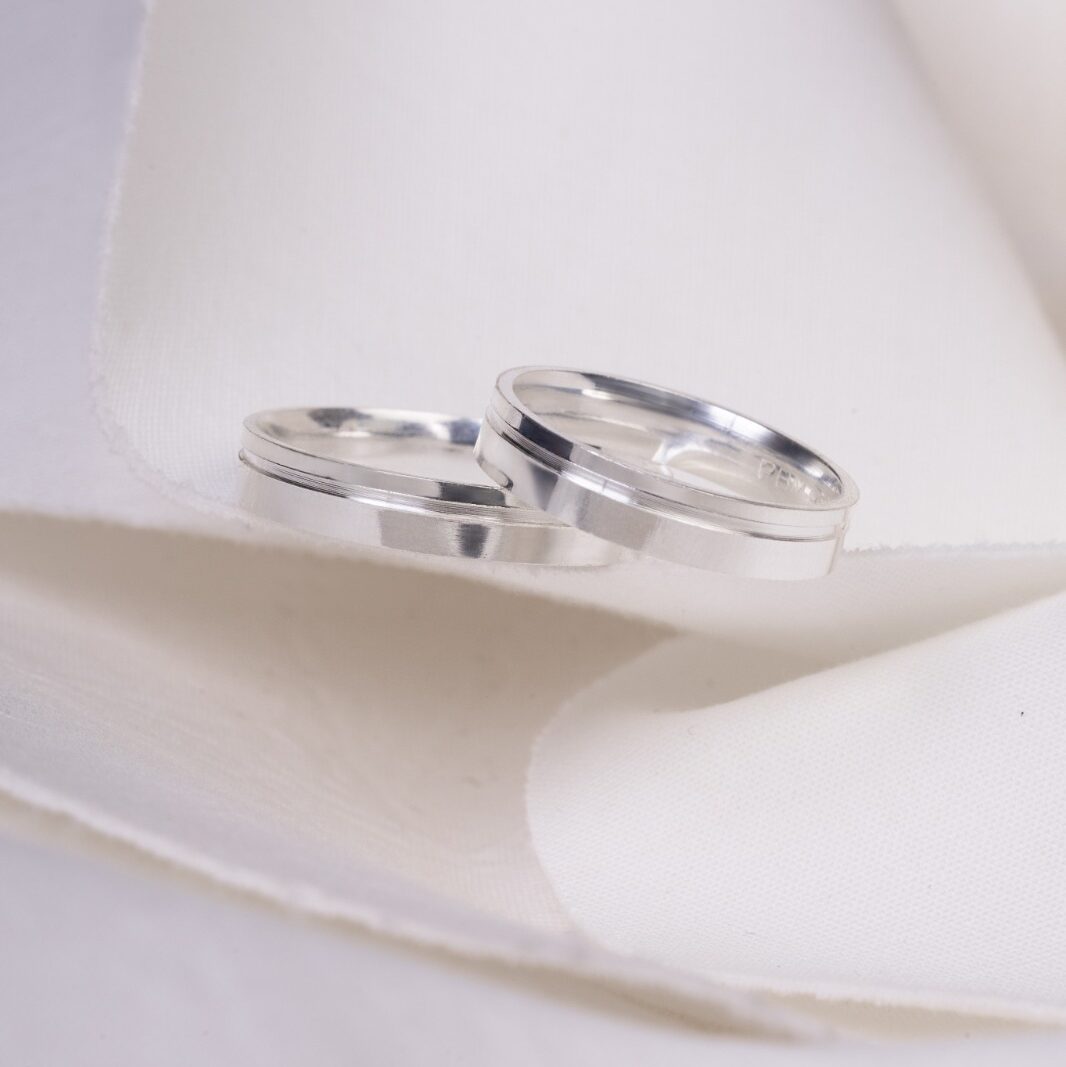 Aliança em prata com friso lateral, que adiciona um detalhe moderno ao visual tradicional. Uma joia elegante e equilibrada, ideal para celebrar o amor com estilo, sutileza e significado duradouro.