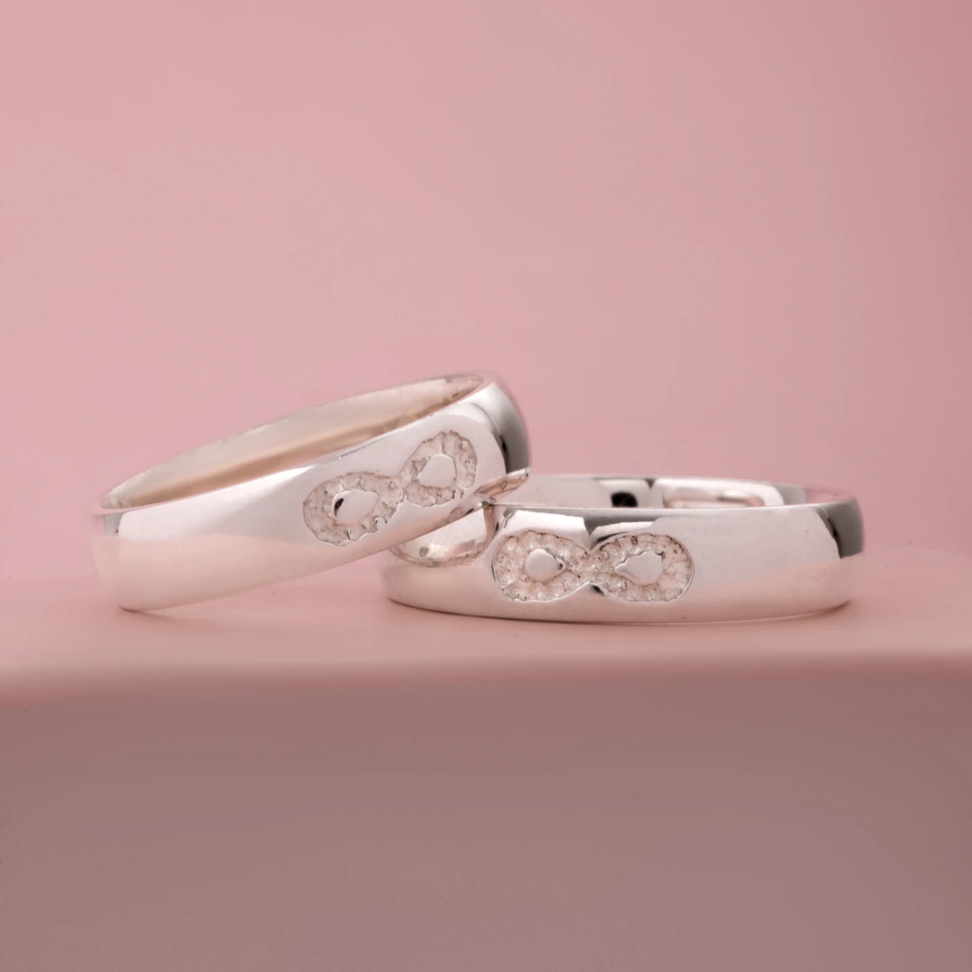 Aliança abaulada com detalhe do símbolo do infinito, representando um amor sem limites e eterno. Com curvas suaves e significado profundo, é a escolha perfeita para selar promessas com romantismo e elegância em cada detalhe.