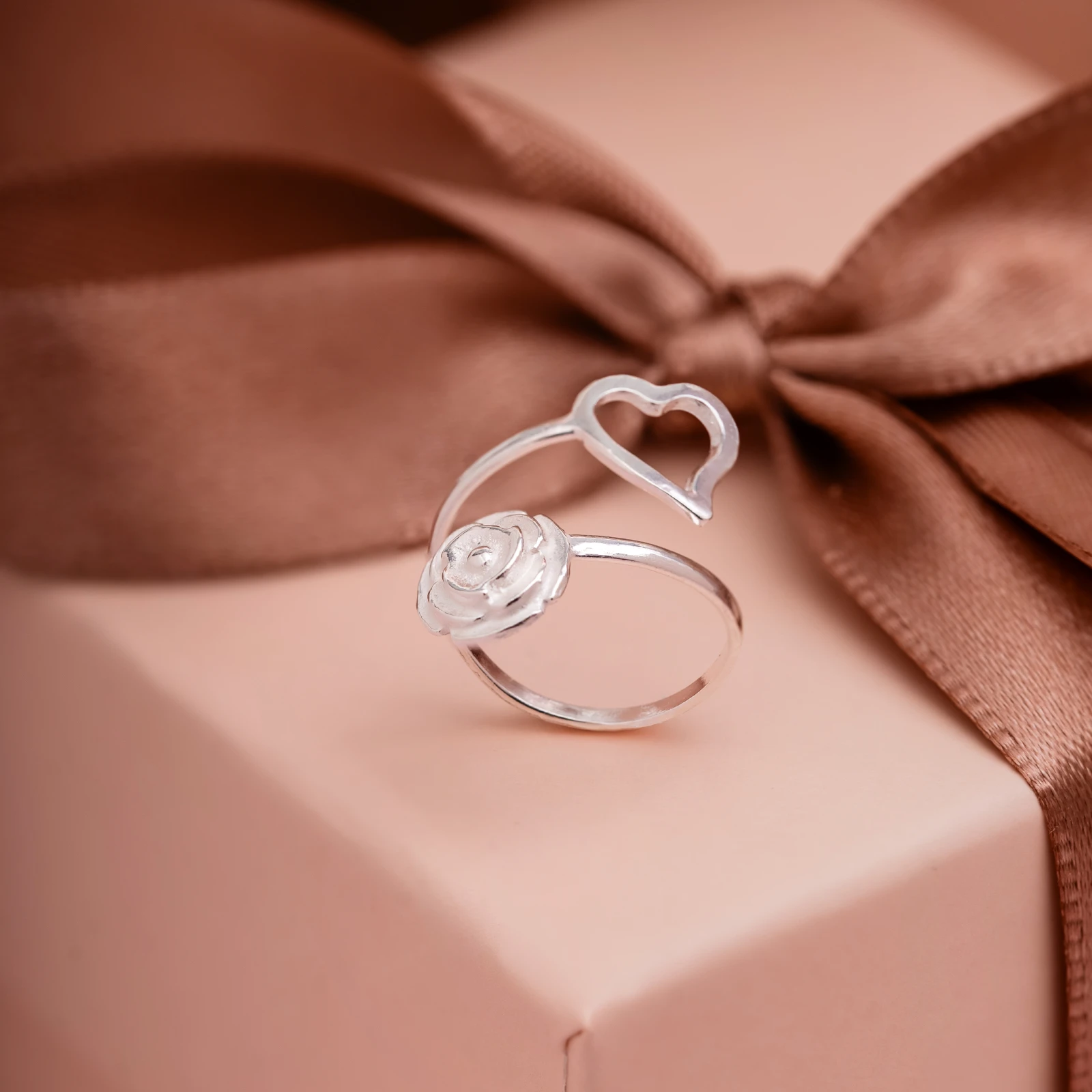 ANEL FALANGE CORAÇÃO VAZADO E ROSA TEXTURIZADA