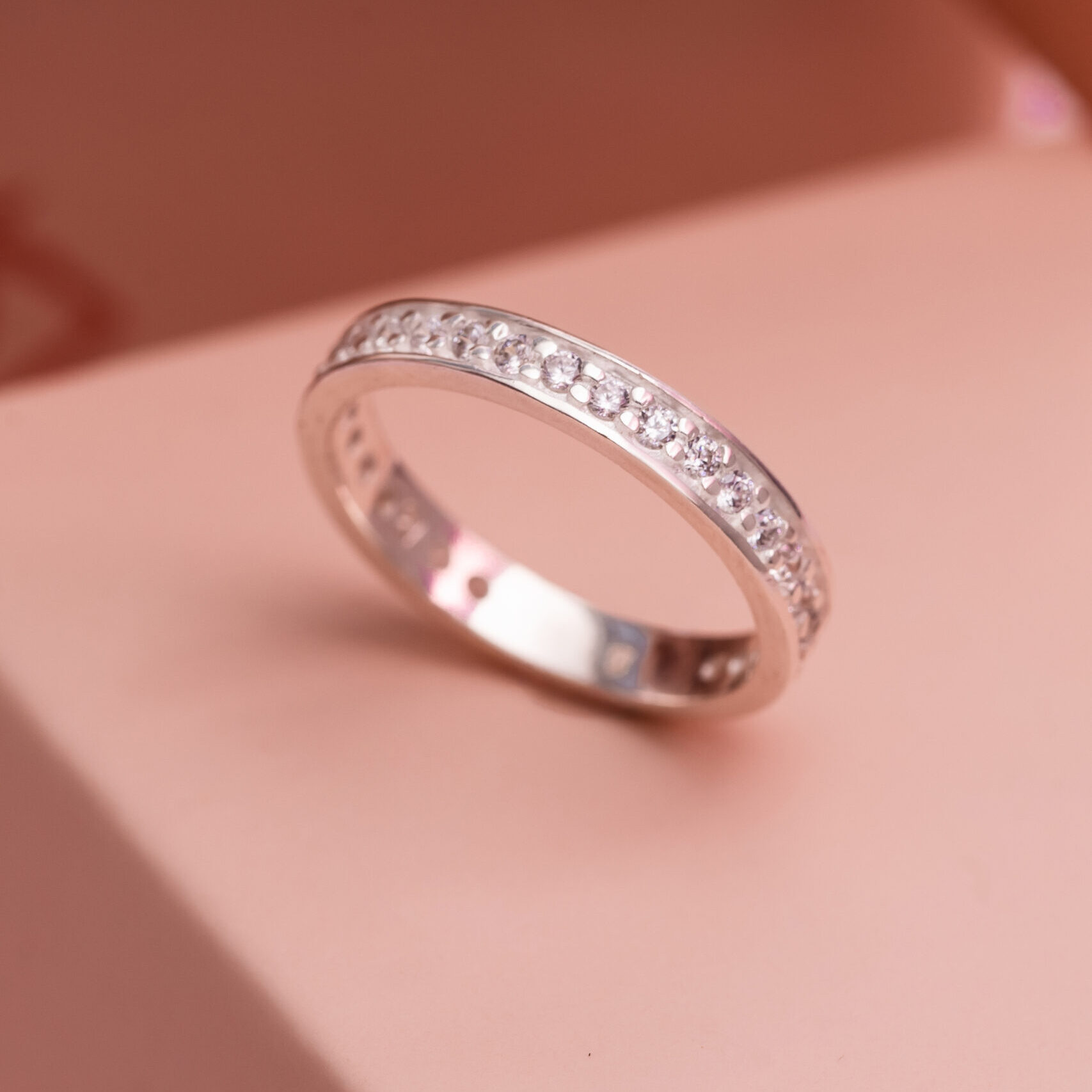 Anel meia aliança em prata com 25 zircônias cravejadas, que criam um brilho contínuo e refinado. Uma joia elegante e marcante, perfeita para celebrar momentos especiais ou adicionar sofisticação a composições do dia a dia.