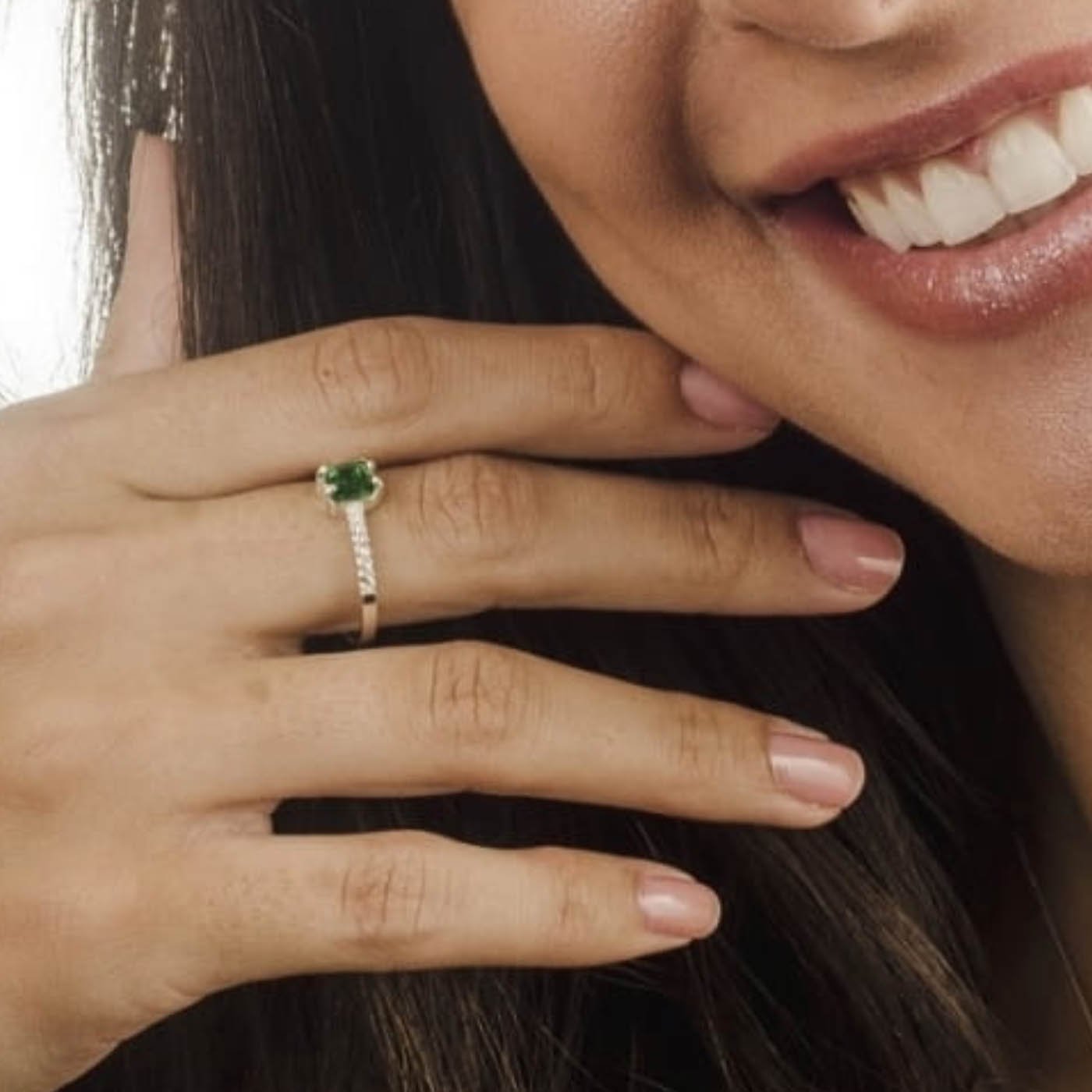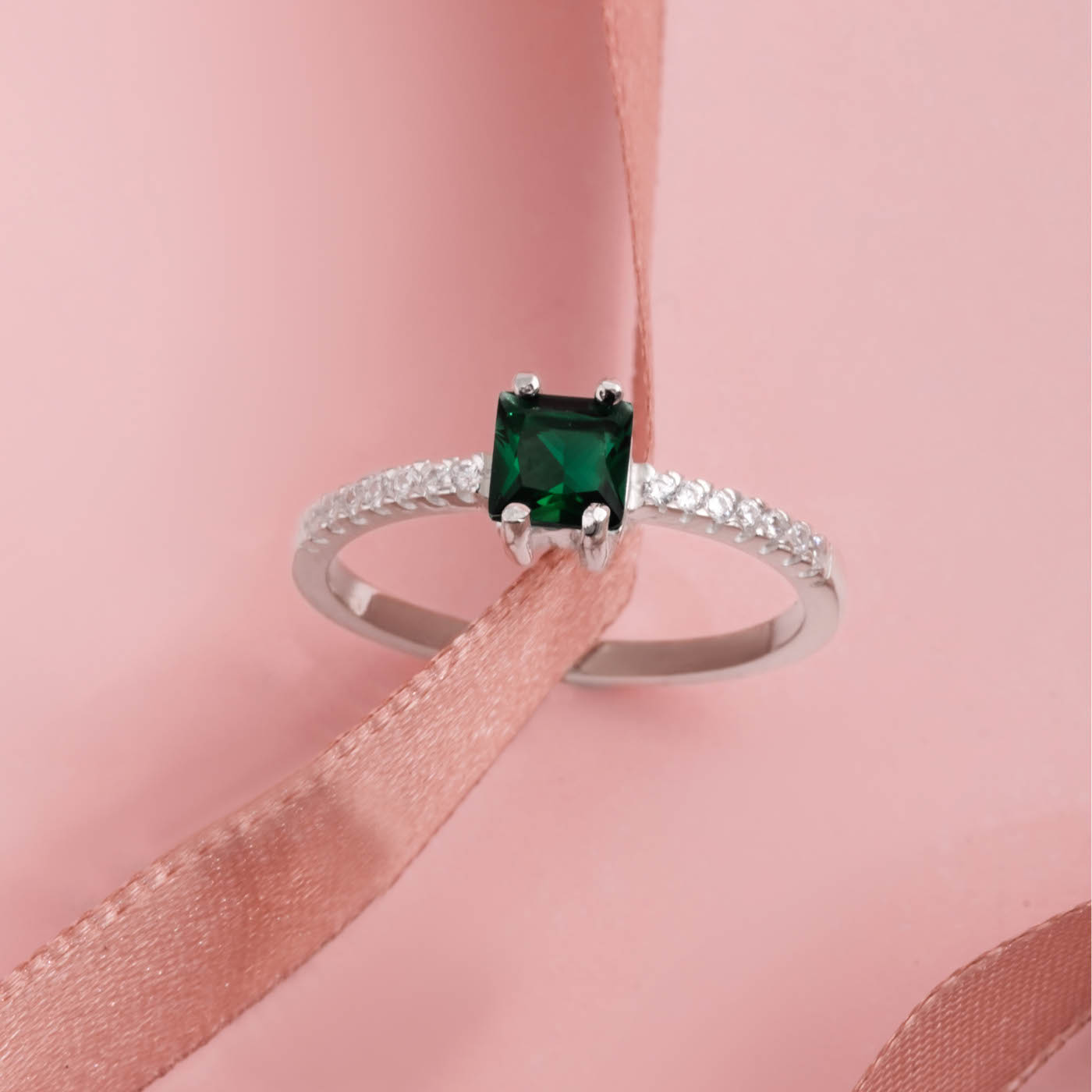 Anel Solitário Carrê com 14 Cristais Cravejados em Verde Esmeralda, uma joia sofisticada que une cor vibrante e delicadeza. A pedra central em corte carrê ganha ainda mais destaque com as laterais cravejadas, refletindo brilho refinado em cada detalhe. Uma peça marcante, perfeita para compor produções elegantes e valorizar suas mãos com estilo único.