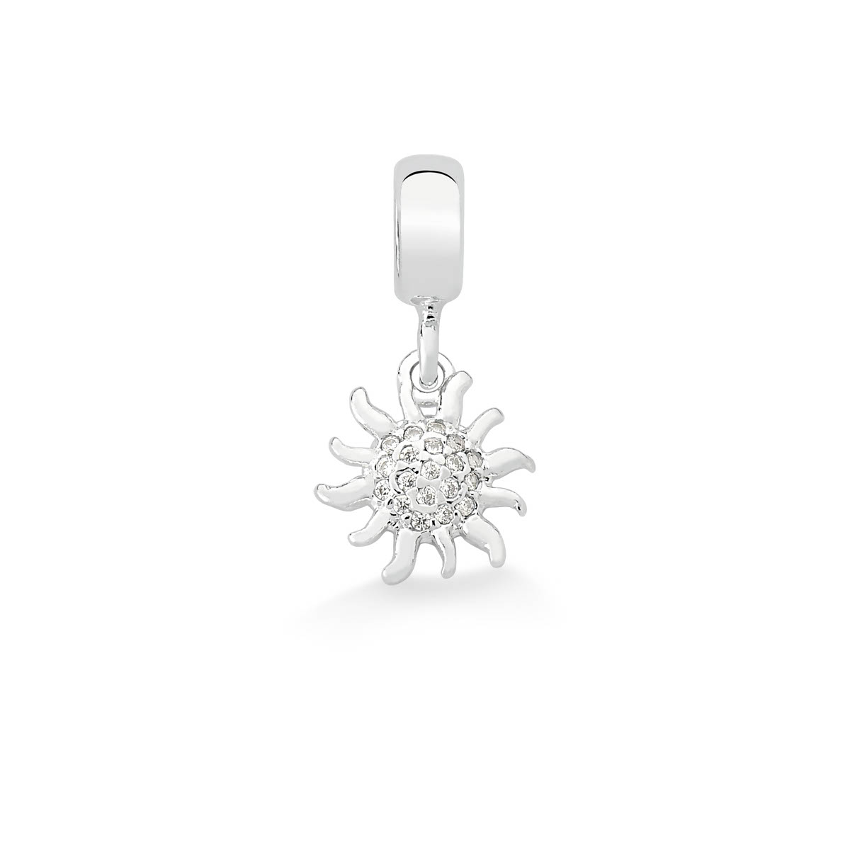 Berloque Sol Cravejado em Prata, um símbolo de luz, energia e vitalidade. O design radiante ganha ainda mais destaque com as zircônias cravejadas, que refletem brilho intenso e sofisticado. Uma joia especial, perfeita para compor sua pulseira com estilo e carregar sempre consigo a força e o calor do sol.