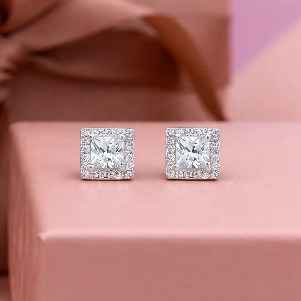 Brinco Princesa com pedra quadrada pequena, delicadamente lapidada e cercada por zircônias que realçam seu brilho. Uma joia discreta e elegante, ideal para o dia a dia ou ocasiões que pedem um toque de sofisticação sutil.