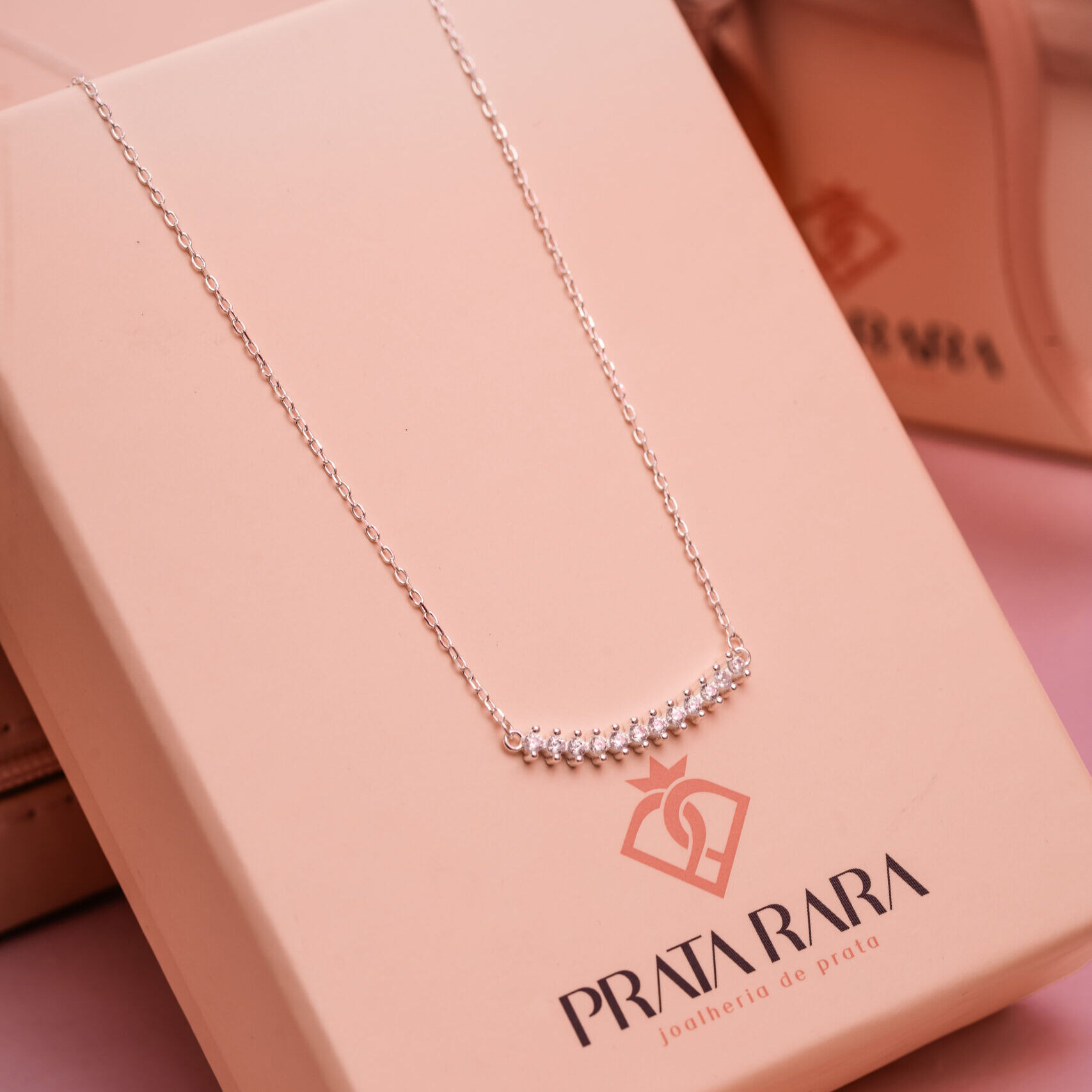 Colar Curvado, uma joia moderna com design levemente curvado e inteiramente cravejado. A linha curvada cria um efeito delicado e refinado, refletindo brilho sutil em cada movimento. Uma peça elegante e versátil, perfeita para destacar o colo com leveza e complementar diferentes estilos com um toque de sofisticação.