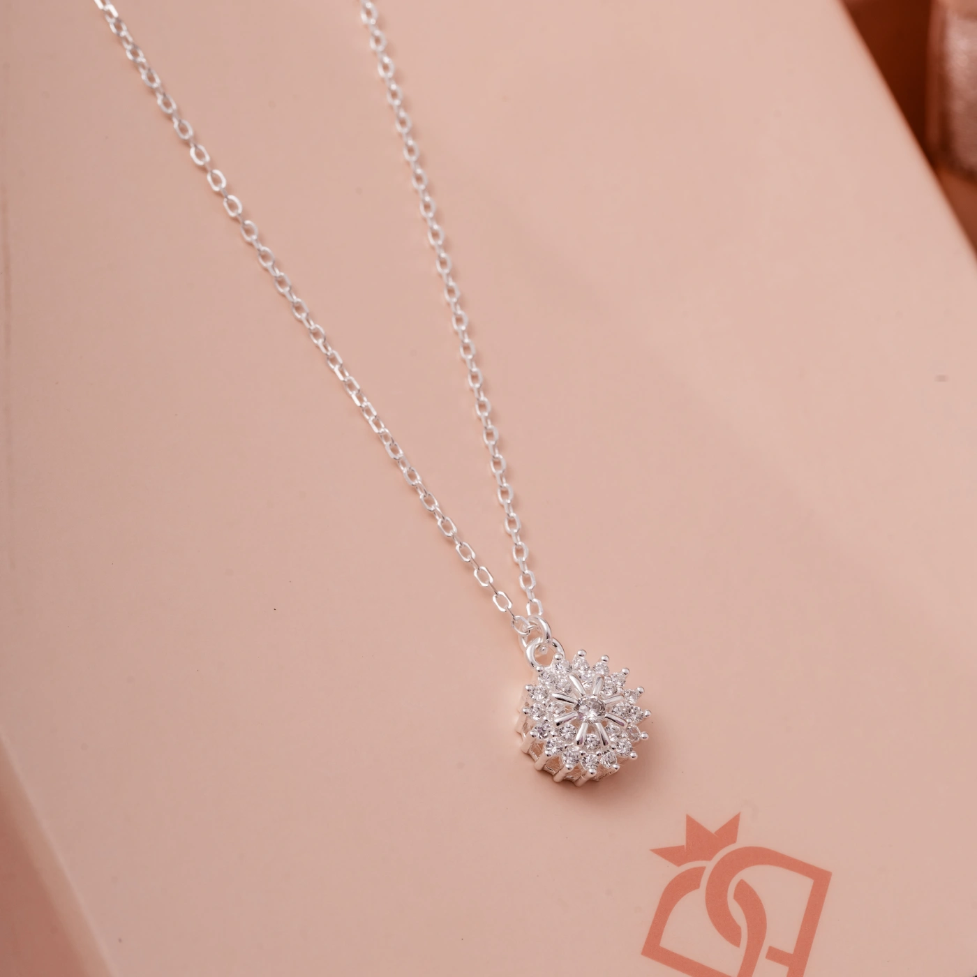 Colar Flor Cravejada em Prata, uma joia delicada que une feminilidade e luminosidade. O pingente em formato de flor recebe zircônias cravejadas que refletem a luz com elegância, criando um visual encantador e sofisticado. Uma peça charmosa, perfeita para iluminar o colo e adicionar um toque delicado e refinado ao seu estilo.